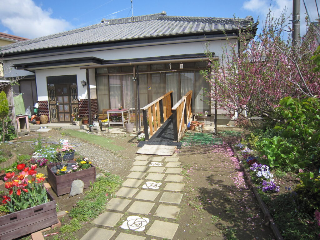 ピンク色のアパートの隣の平屋が当施設です。